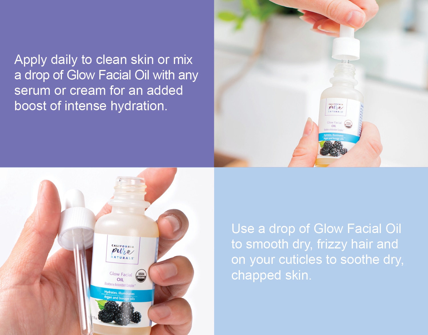 Our unique USDA Certified Organic Glow Facial Oil is a lightweight, luxurious, multi-functional serum that supports all skin types. Featuring a blend of organic oils, essential fatty acids and powerful antioxidants, it leaves skin feeling more hydrated, softer and smoother than ever before.