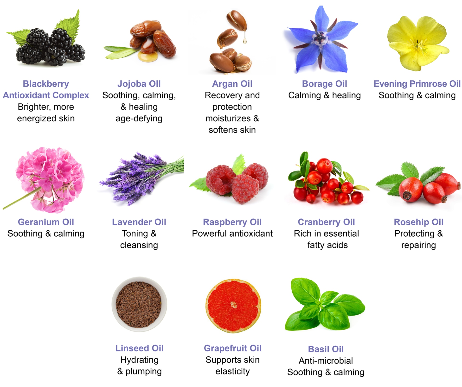 Known for their age-defying benefits, the exotic oils Rosehip, Evening Primrose, Jojoba and Argan promote regeneration and nourish the skin to produce a healthy, illuminated appearance. Cranberry, Linseed and Grapefruit oils lend their beneficial healing and brightening powers, while Raspberry, Geranium, Borage and Basil oils soothe blemishes and inflammation, protecting and repairing the skin from damage.